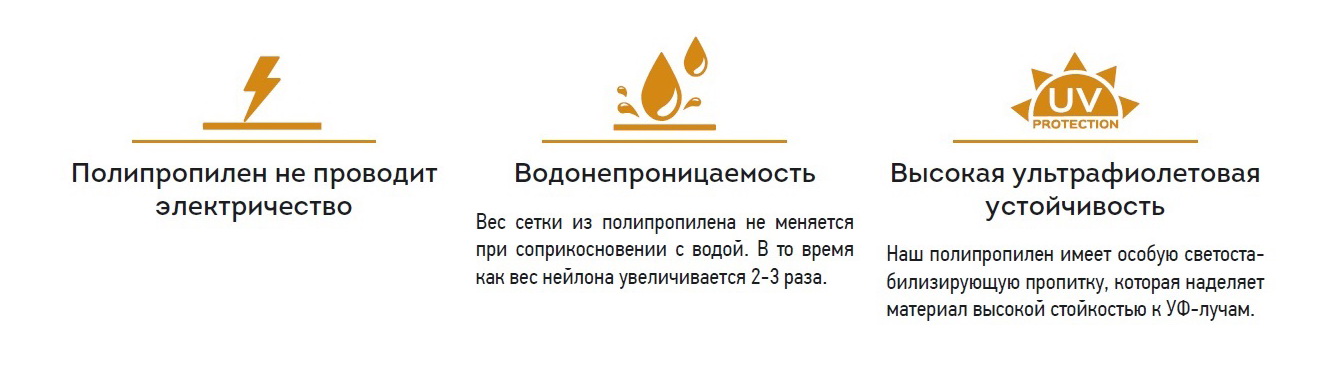 PP = высокопрочный полипропилен (100%)Высокопрочный полипропилен является основным материалом, который используется для изготовления безузловых сетей. Важной особенностью волокон из полипропилена является их высокая устойчивость к изгибу, т.е. способность выдерживать без разрушения очень резкие перегибы, стабильность форм, наряду с высокой прочностью полипропиленовые волокна характеризуются устойчивостью к истиранию, действию многократной деформации, а также сетеполотна являются стойкими к гниению. Сетка со стандартной стабилизацией против УФ излучения 100 килолэнгли, обеспечивает эффективную защиту от света. Влагопоглащение 0% не боится влаги и любых атмосферных осадков. Безузловые сетки из высокопрочного полипропилена могут использоваться в бесчисленных областях, разнообразие форм ячеек - шестигранные, ромбовидные, четырехугольные и пр. Широкая гамма цветов полипропиленовых нитей. Окрас сетки производится в массе самого материала, то есть, краситель добавляется в массу материала на стадии его изготовления именно поэтому сетка не выцветает.