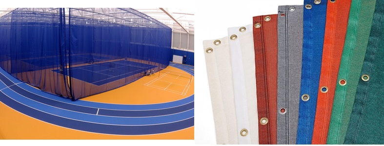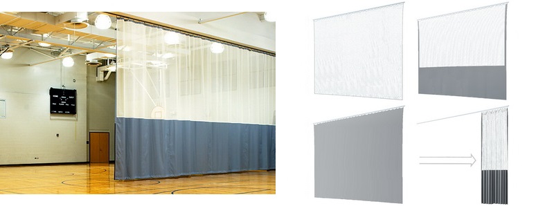 Комбинированные - нижняя часть выполняется из ткани, верхняя из полипропиленовой сетки. Применяются для деления залов на секторы, не препятствуя эффективной работе систем вентиляции и освещения.
