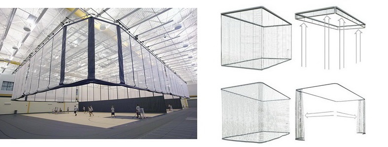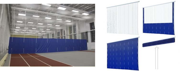 Позволяет проводить несколько различных занятий в одном большом зале не мешая друг другу. Вертикальные и горизонтальные системы (шторы) разделения зала с ручным или автоматическим приводом позволяют реализовать любые конфигурации спортзалов, арен, комплексов. |